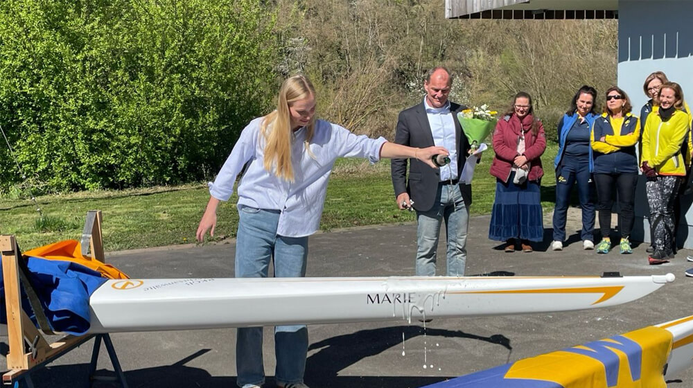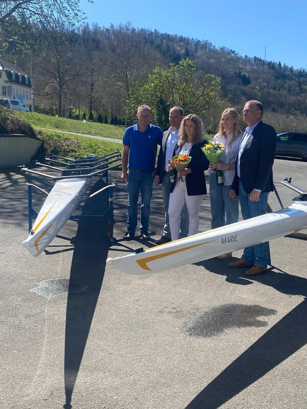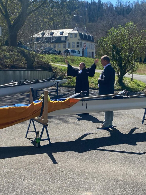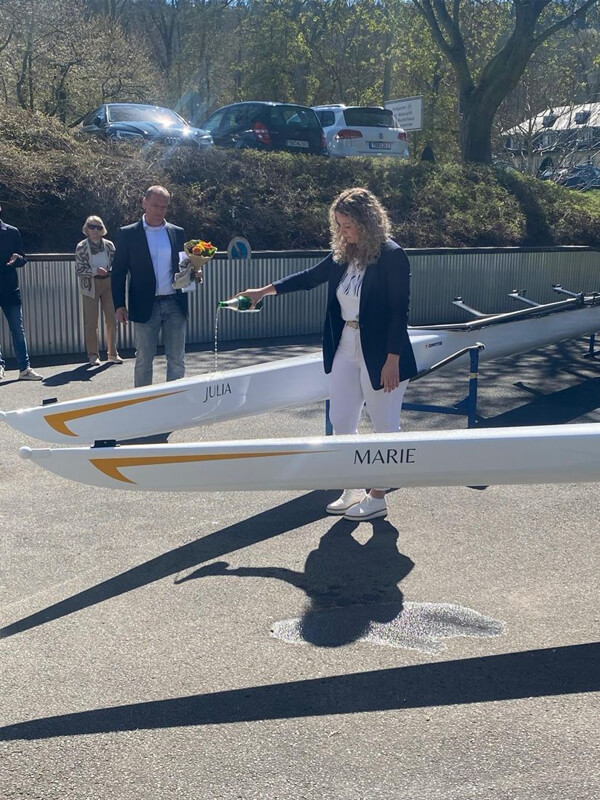 Mit einem besonders feierlichen Akt wurden die beiden neuen Rennboote der RGW vor dem Start in die neue Rudersaison durch Pfarrerin Sophia Weber gesegnet und erhielten von ihren beiden Taufpatinnen mit einem Schuss Sekt ihre Namen. Der Doppelzweier „Marie“ wurde von Marie Kober getauft, der Doppelvierer „Julia“ von Julia Seipp.