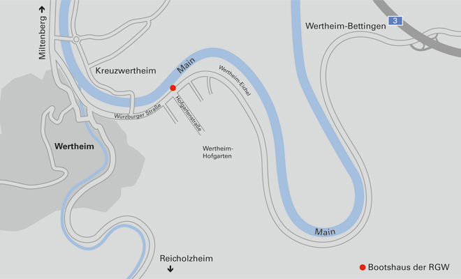 Von der Autobahn (A3, AS 66 Wertheim/Lengfurt) kommend, liegt das Bootshaus der RGW nachdem Sie die Ortschaft Wertheim-Eichel passiert haben, nach ca. 200 m als erstes Haus auf der rechten Straßenseite (gegenüber Hofgartenstraße).